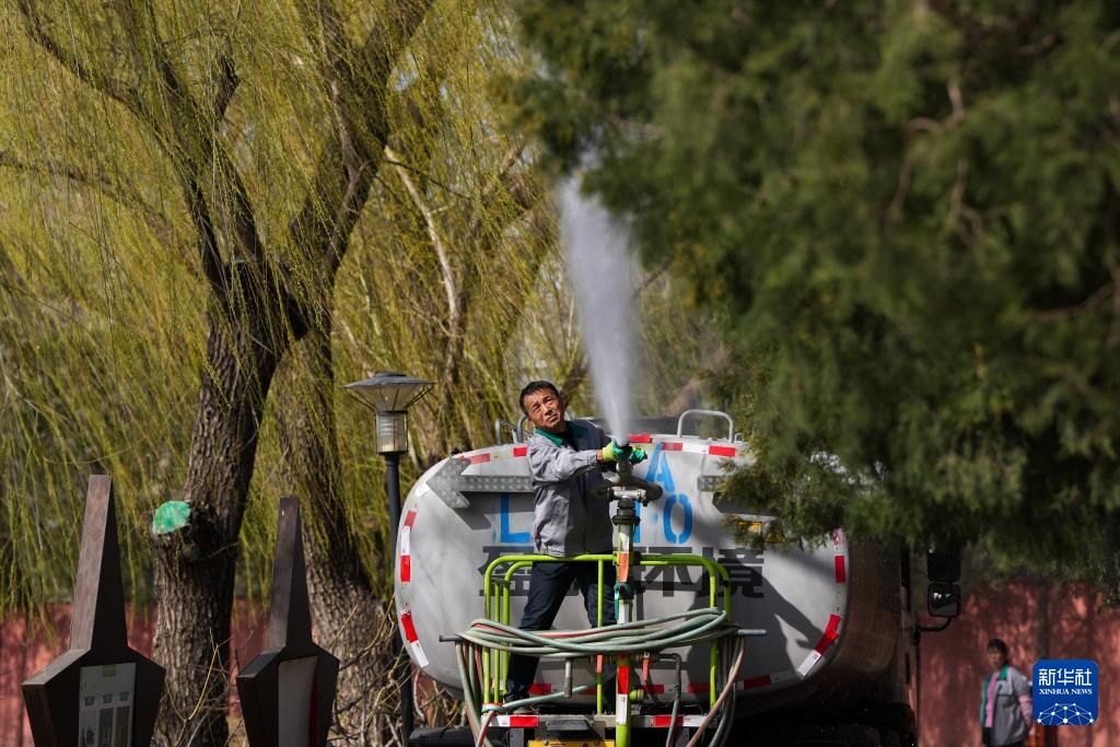在北京红领巾公园内,工作人员喷淋开花的柏树(3月19日摄)。