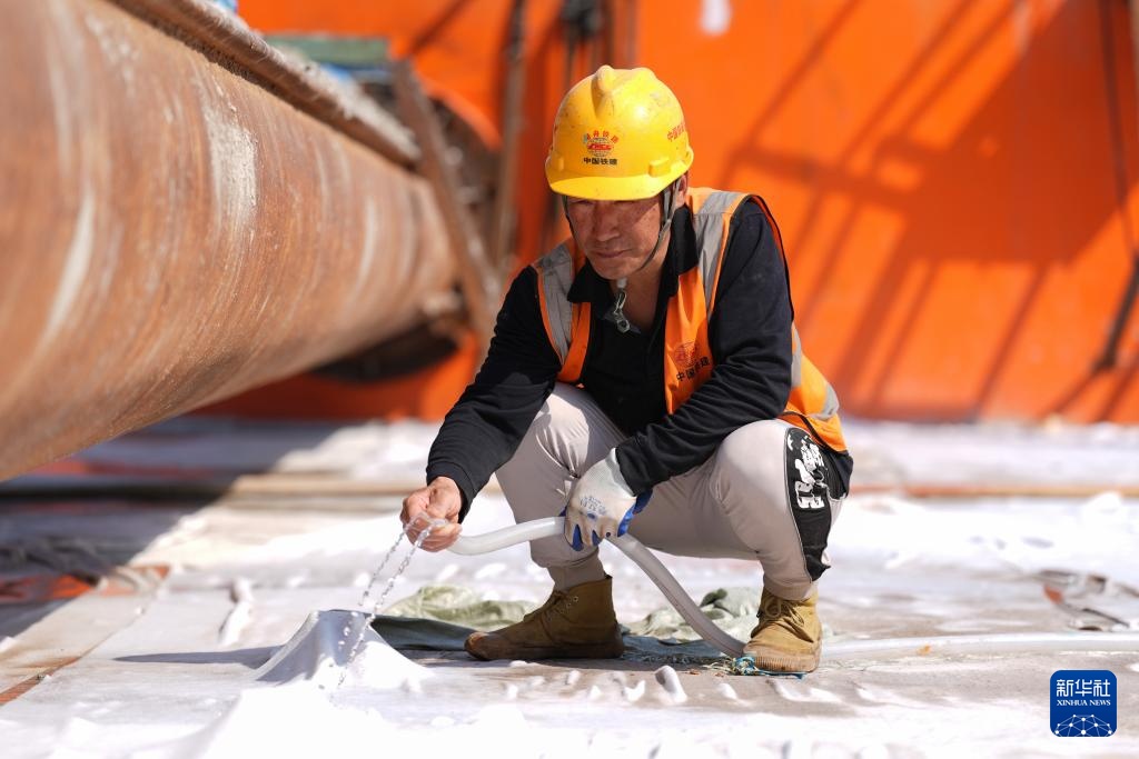 3月22日,中国铁建大桥局建设者在甬舟铁路桃夭门公铁两用大桥5号主墩承台养护完成浇筑的混凝土。