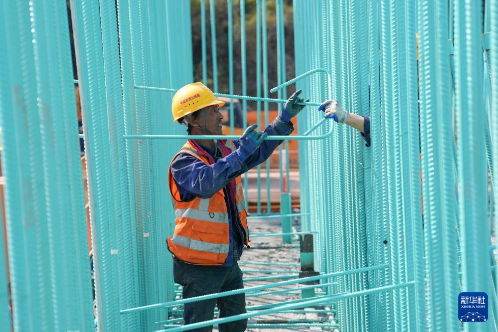 3月22日,中国铁建大桥局建设者在甬舟铁路桃夭门公铁两用大桥5号主墩承台作业。