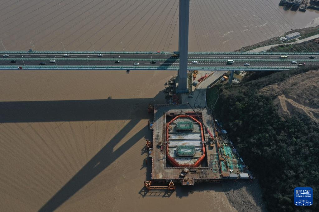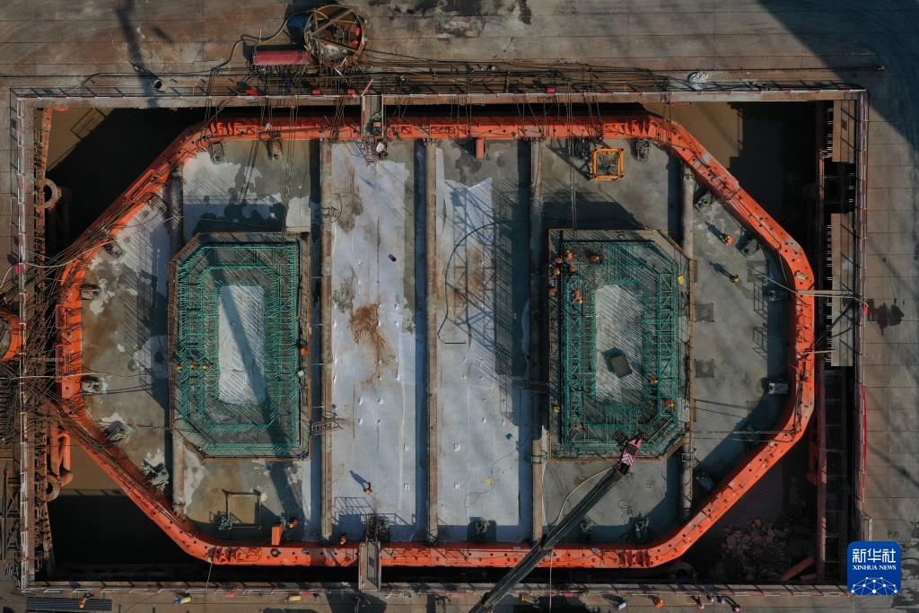 3月22日拍摄的甬舟铁路桃夭门公铁两用大桥5号主墩承台(无人机照片)。