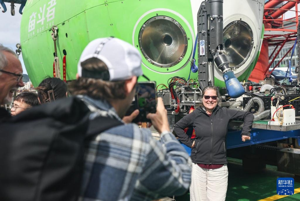 3月21日,在新西兰首都惠灵顿举行的中国-新西兰普伊斯哥海沟载人深潜联合科考总结开放日活动中,参观者在“探索一号”科考船上与“奋斗者”号载人潜水器合影。