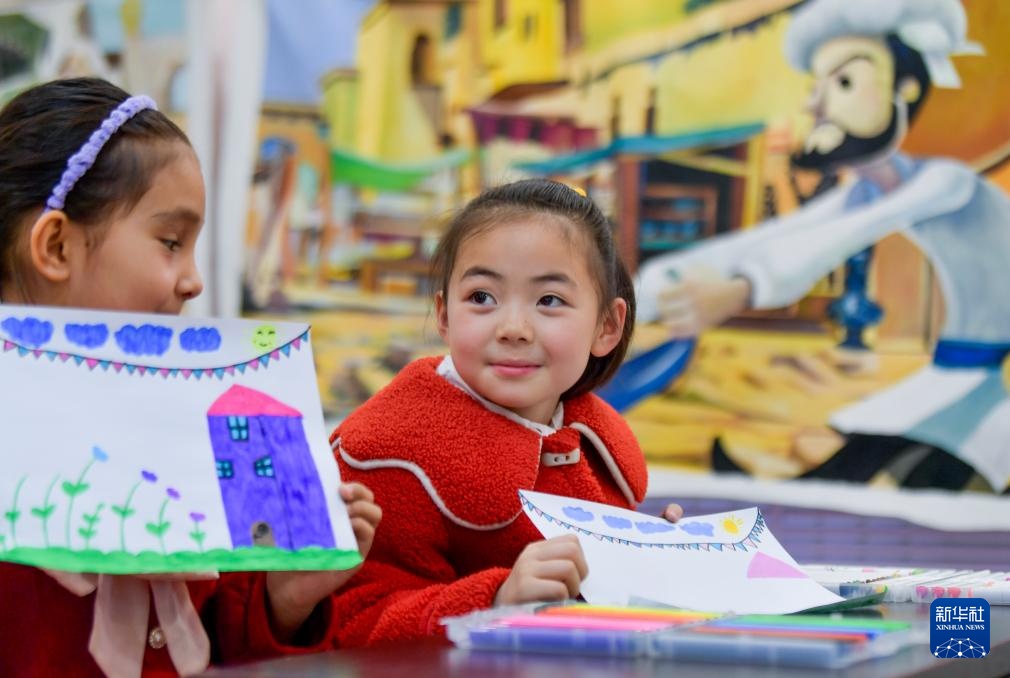 在乌鲁木齐市水磨沟区苇湖梁片区立井南社区,小朋友在公益美术课上学习绘画(3月22日摄)。