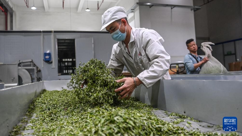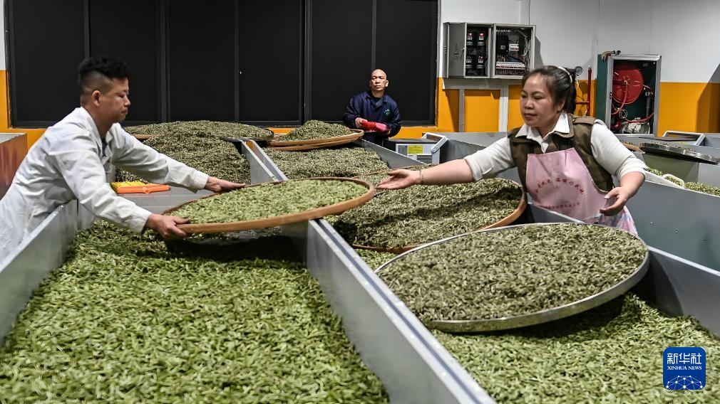 3月22日,在三江县御香茶业有限公司车间,工人在制作白茶。