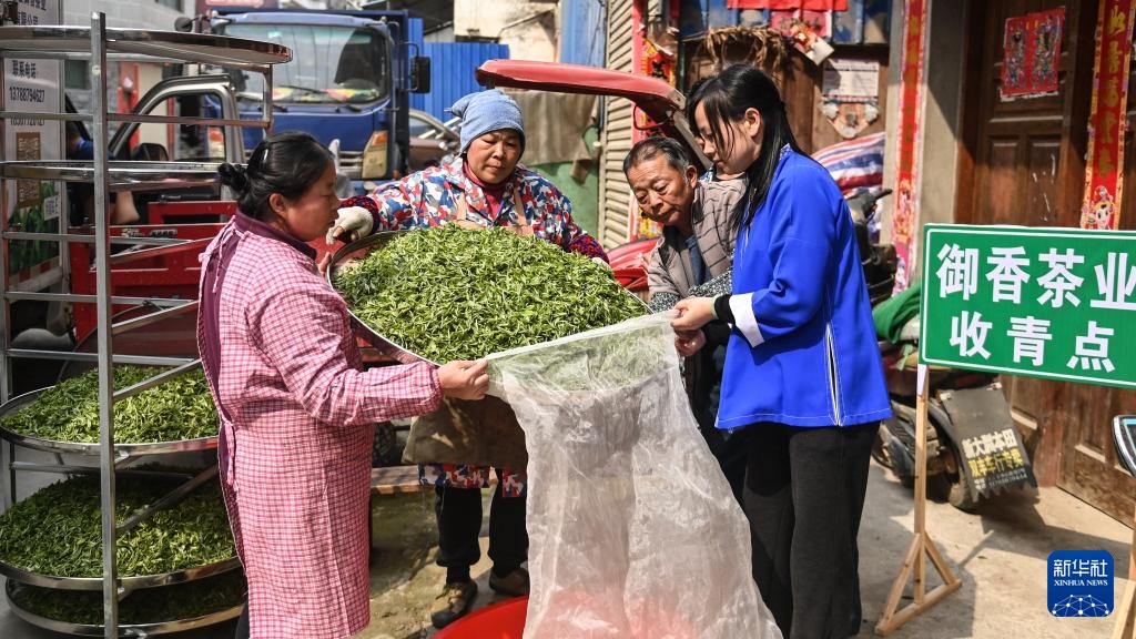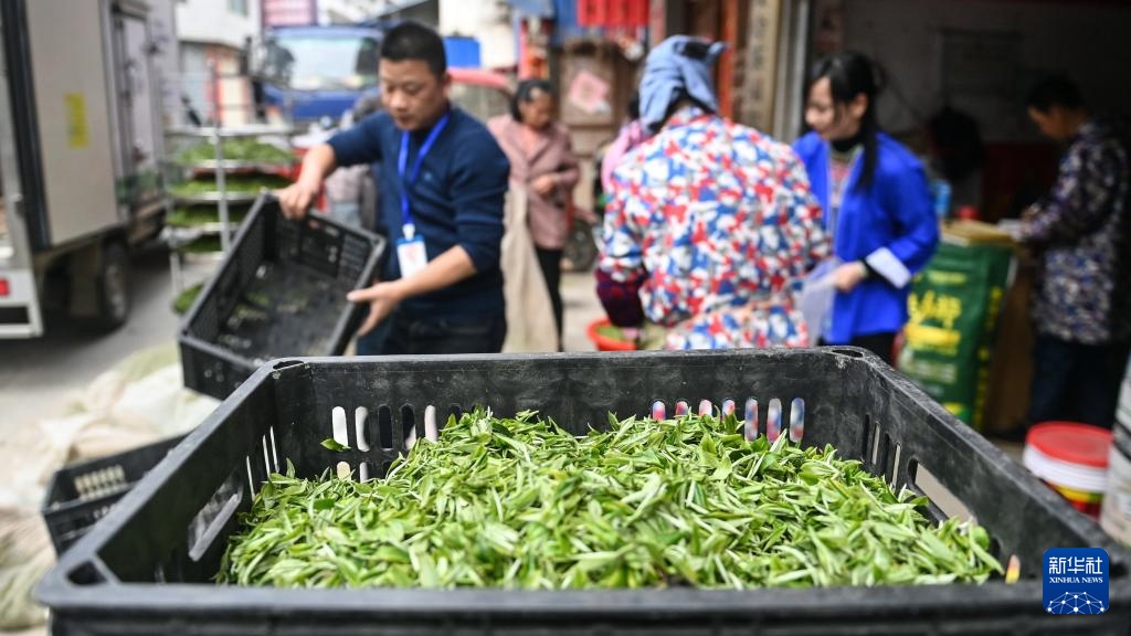 3月22日,在三江侗族自治县独峒镇八协村,茶农在御香茶业收青点出售采摘的茶青。