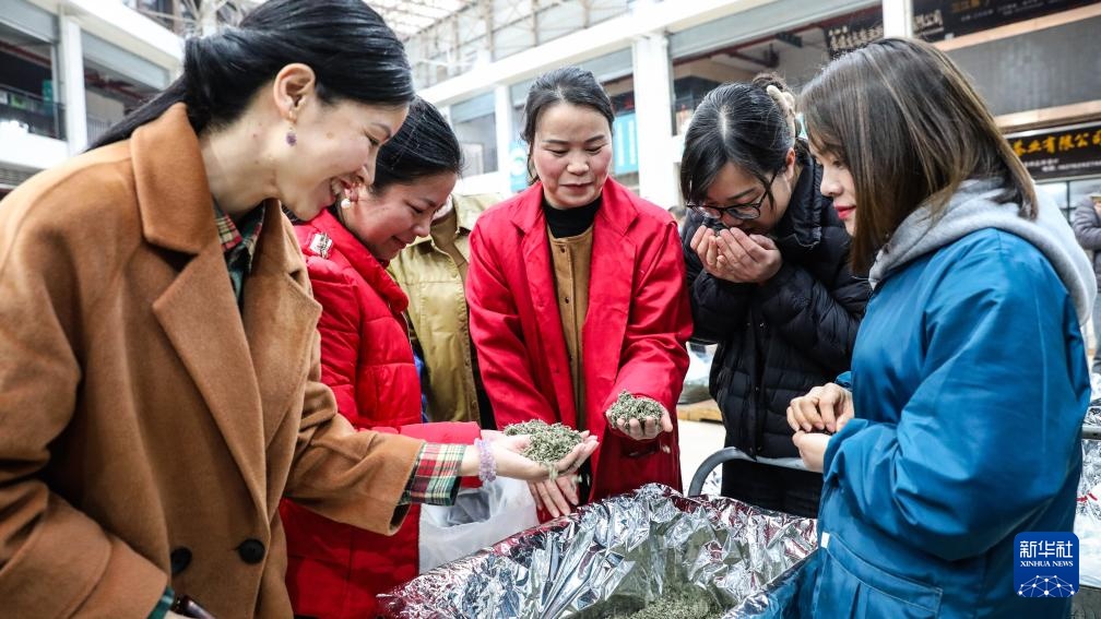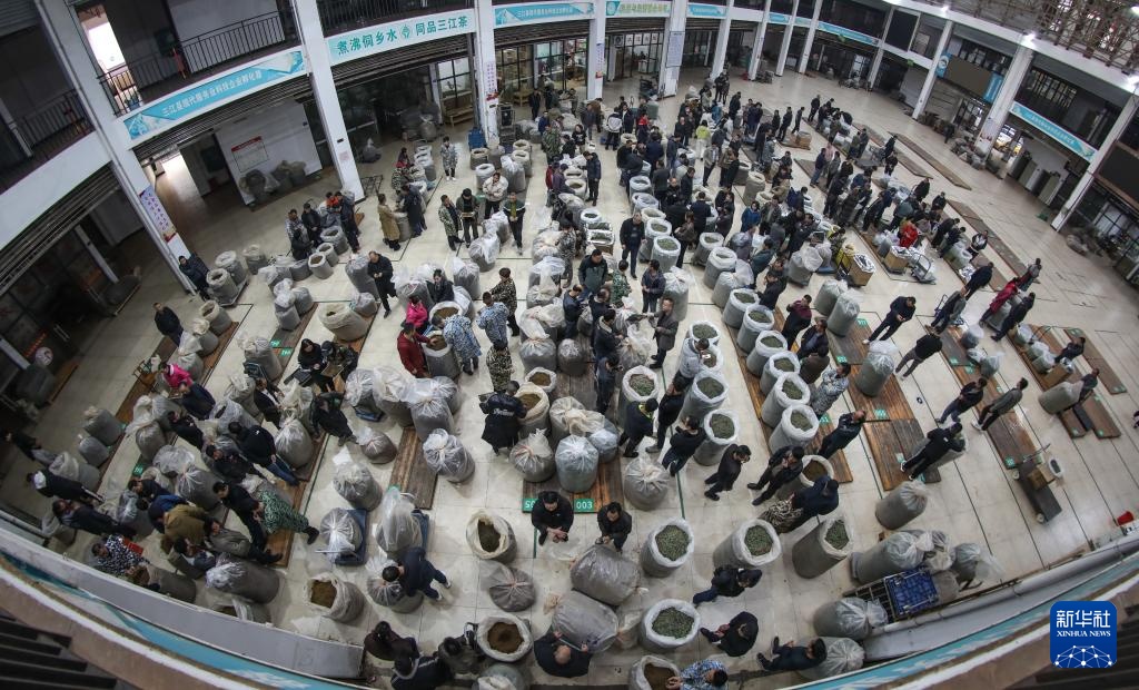 在三江侗族自治县的茶叶交易市场,茶商们在选购茶叶(3月22日摄)。