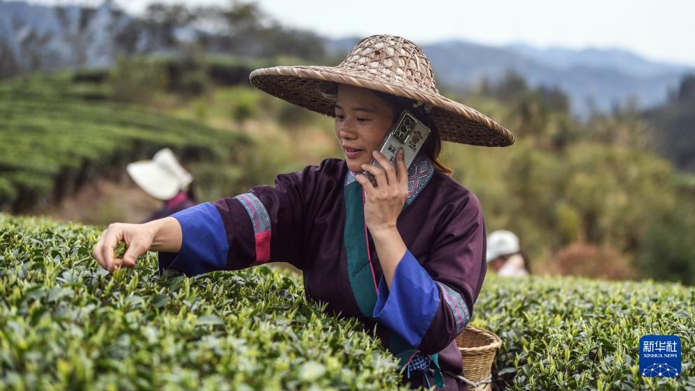 在三江侗族自治县同乐苗族乡寨大村茶园,一名茶农在给收青点报告当天茶青采摘量(3月21日摄)。