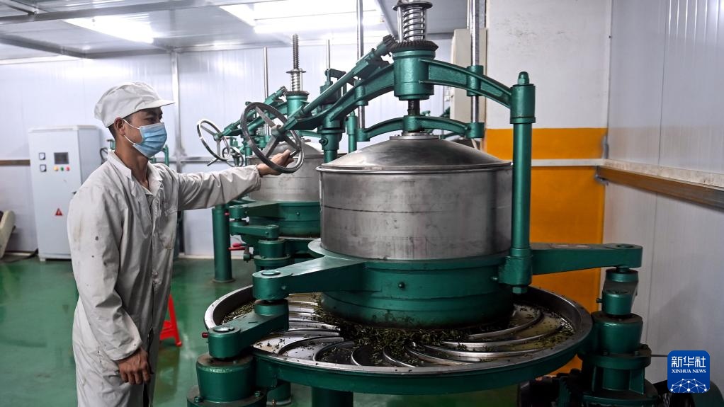 3月22日,在三江县御香茶业有限公司车间,一名工人在操作机器处理茶叶。