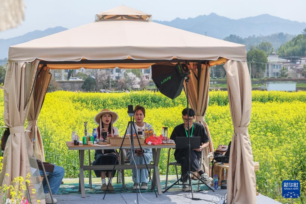 3月23日,主播在更楼街道城南城市田园油菜花田边的直播间内推介当地文旅项目。