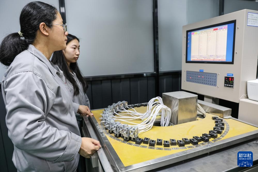 西科冷链江门制造基地的产品实验室工程师进行电子元件耐用性测试(3月22日摄)。