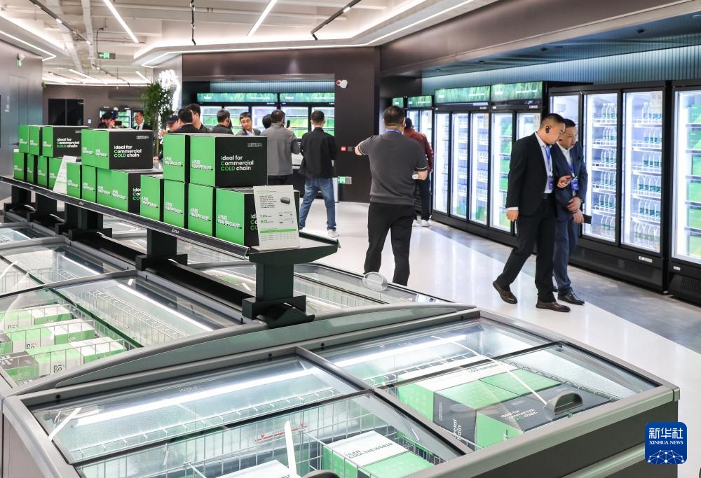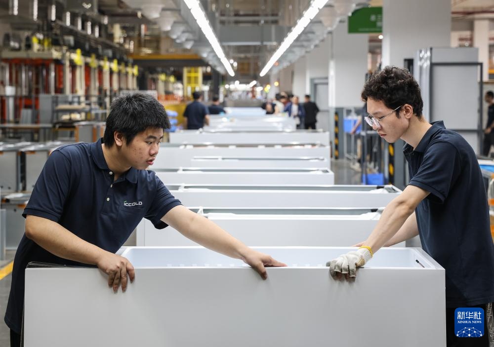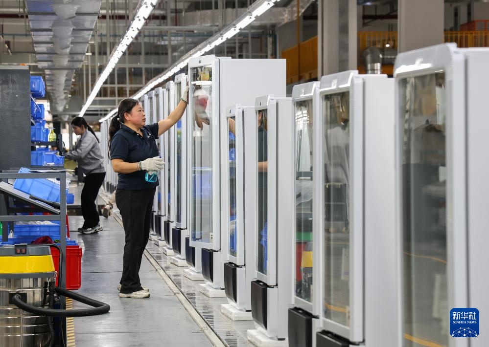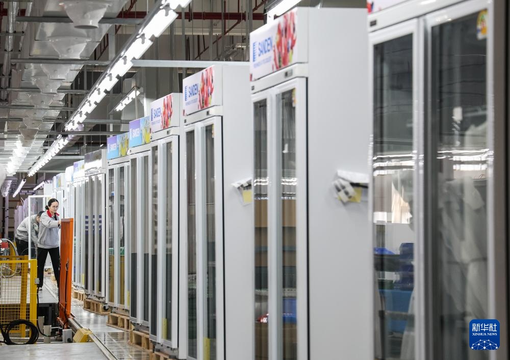 西科冷链江门制造基地的产线上,工人对一批出口海外的商用冷柜进行外观检查(3月22日摄)。