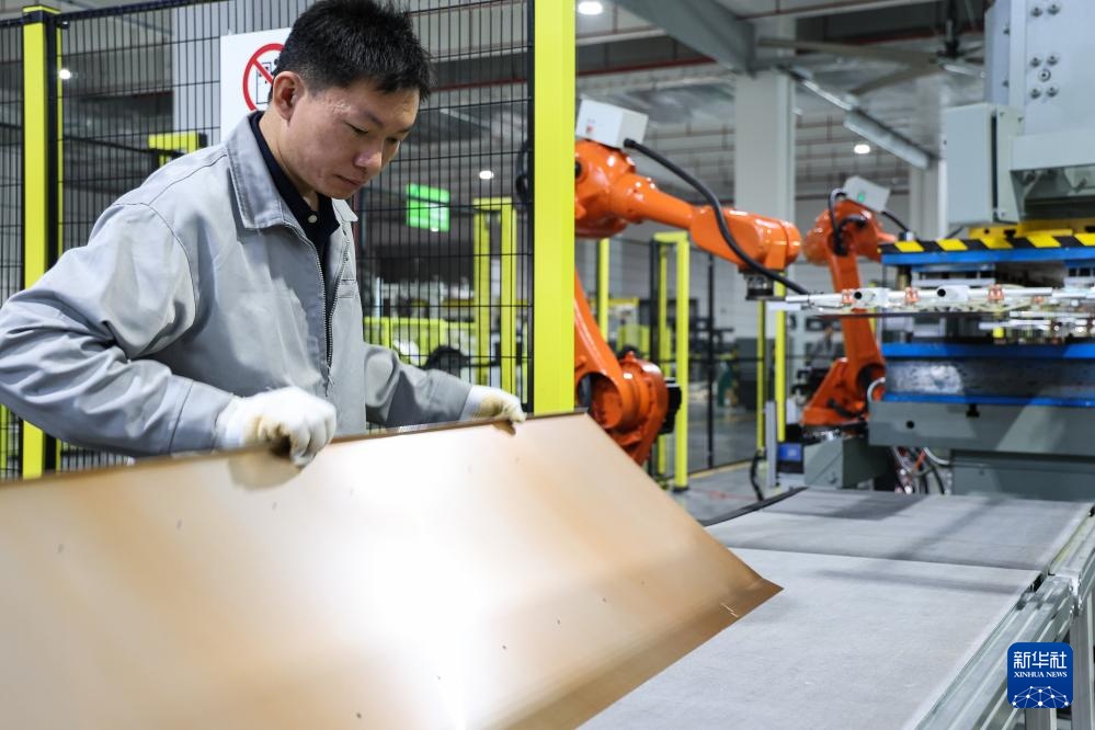 工人在西科冷链江门制造基地的商用冷链设备生产线上检查机器人加工的面板(3月22日摄)。