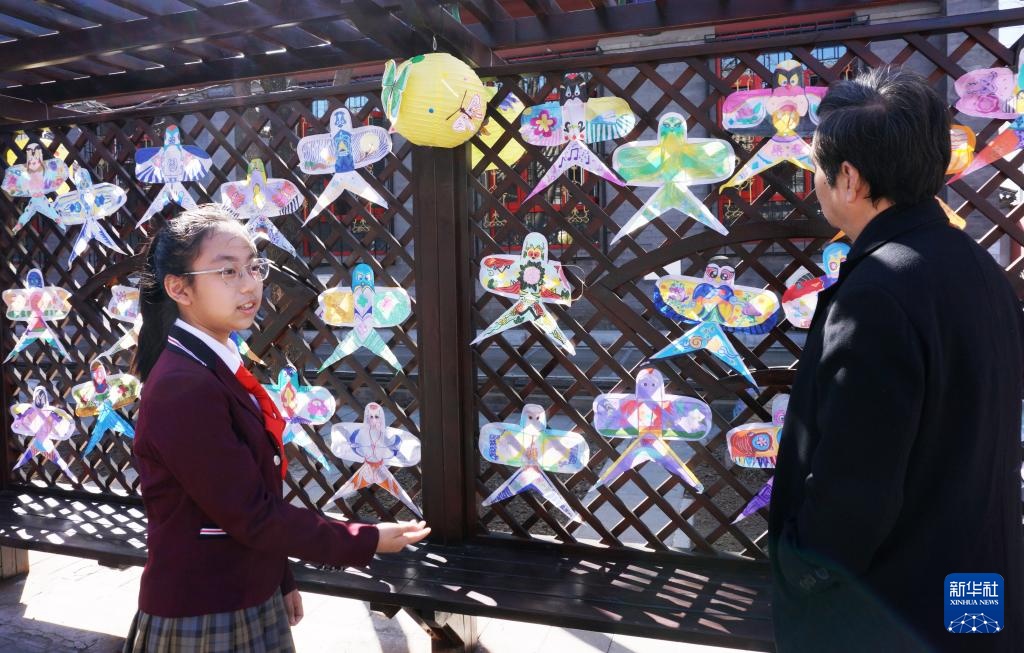 3月24日,府学胡同小学学生向来宾介绍同学们绘制的风筝。