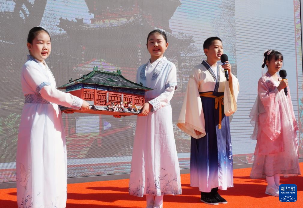3月24日,府学胡同小学学生在书画摄影展开幕式上表演歌舞。