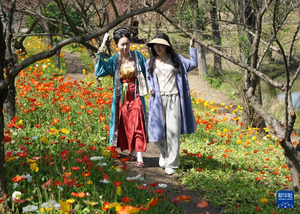 3月24日,游客在西溪湿地一条小径上欣赏开放的虞美人。