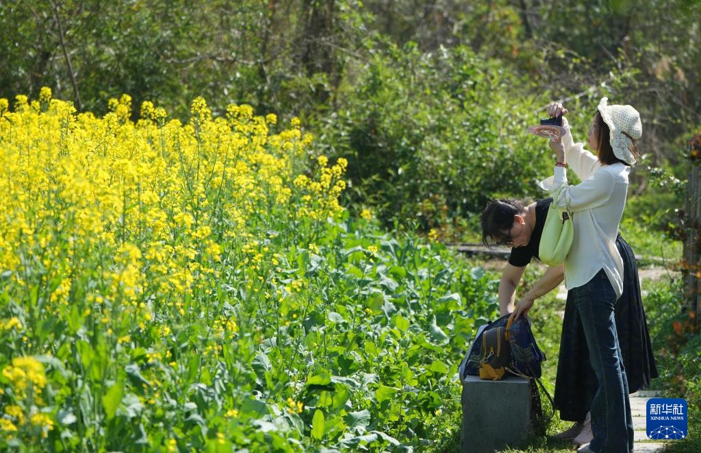 3月24日,游客在西溪湿地一片油菜花旁拍照。