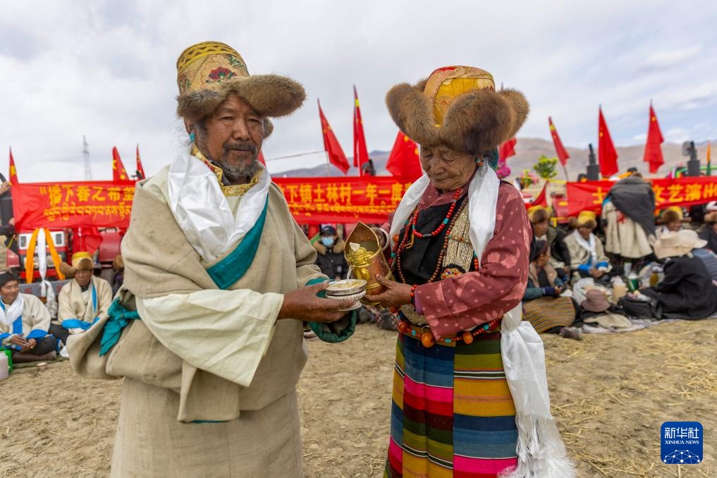 作为村中长者,尼玛(左)在春耕仪式上接受敬酒(3月16日摄)。