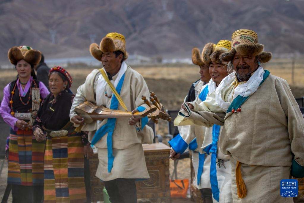尼玛(右一)在春耕仪式上带领村民载歌载舞(3月16日摄)。