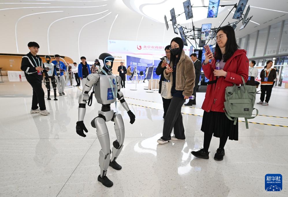 3月26日,中关村国际创新中心的一款正在行走的宇树G1机器人吸引人们拍照留影。