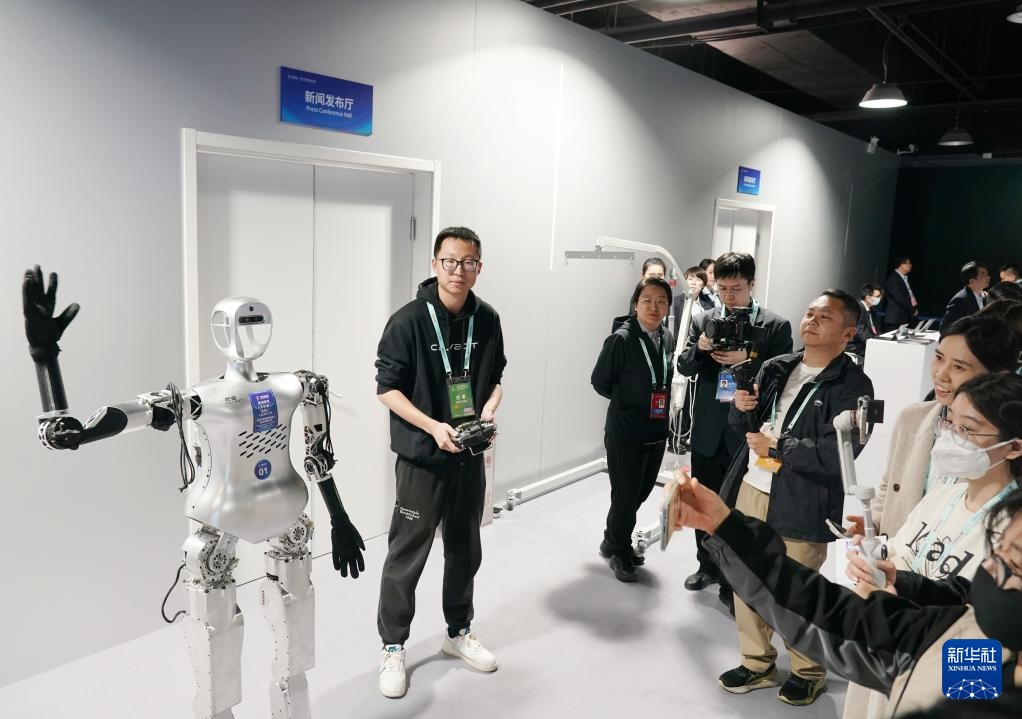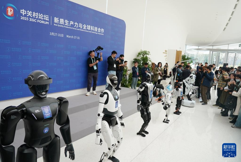 3月26日,媒体记者在2025年中关村论坛年会新闻中心参观灵宝双足人形机器人“星期二”。