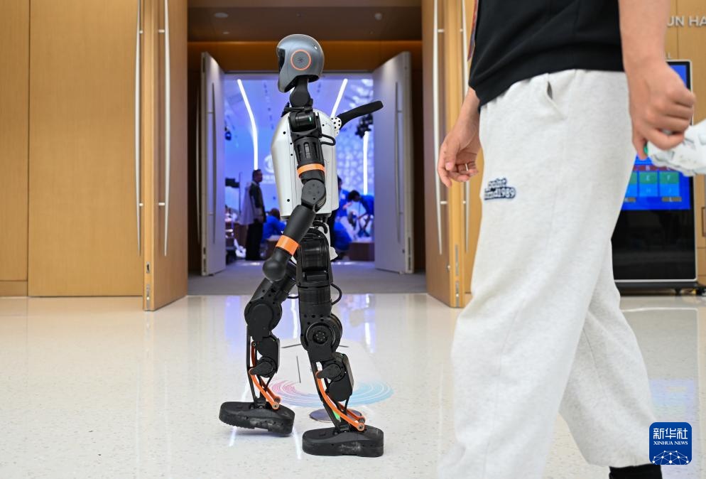 3月26日,一款加速T1机器人行走在中关村国际创新中心内。