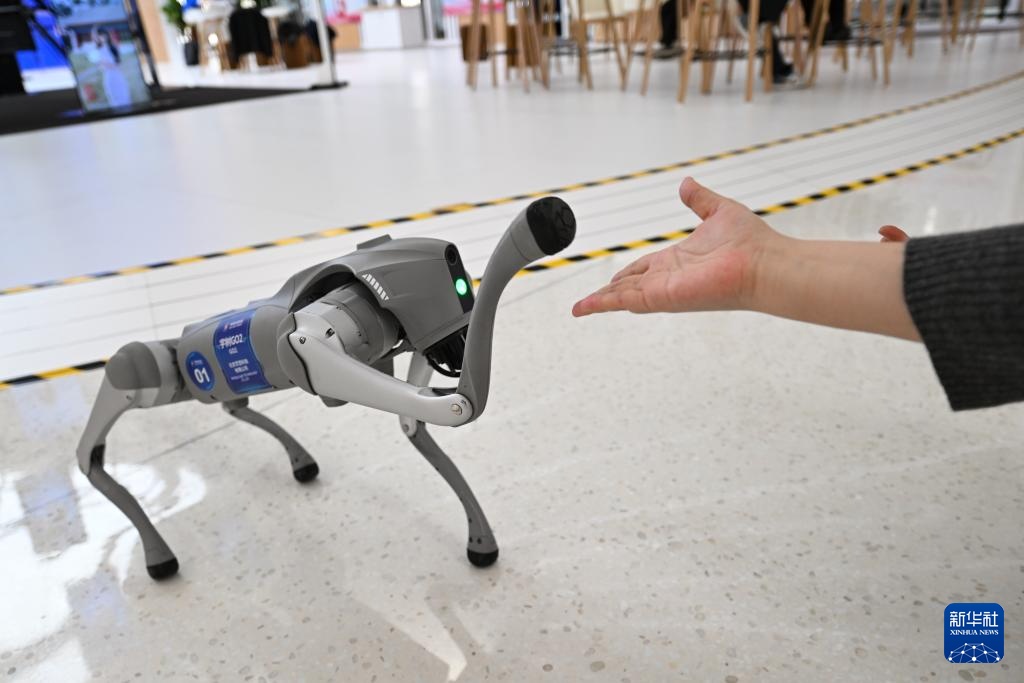 3月26日,一款宇树Go2机器狗在中关村国际创新中心与人互动。