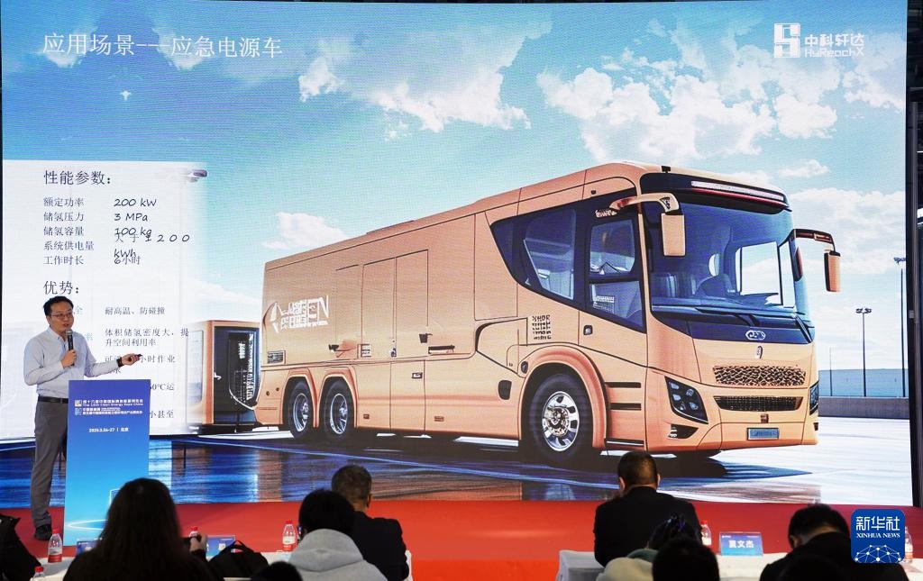 3月26日,参展方代表在2025中国国际清洁能源博览会上向观众介绍新型氢能源应急电源车。