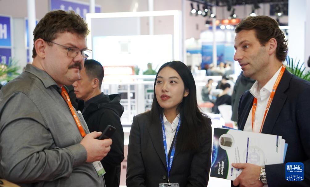 3月26日,两名外国专业观众在2025中国国际清洁能源博览会上与中方代表交流。