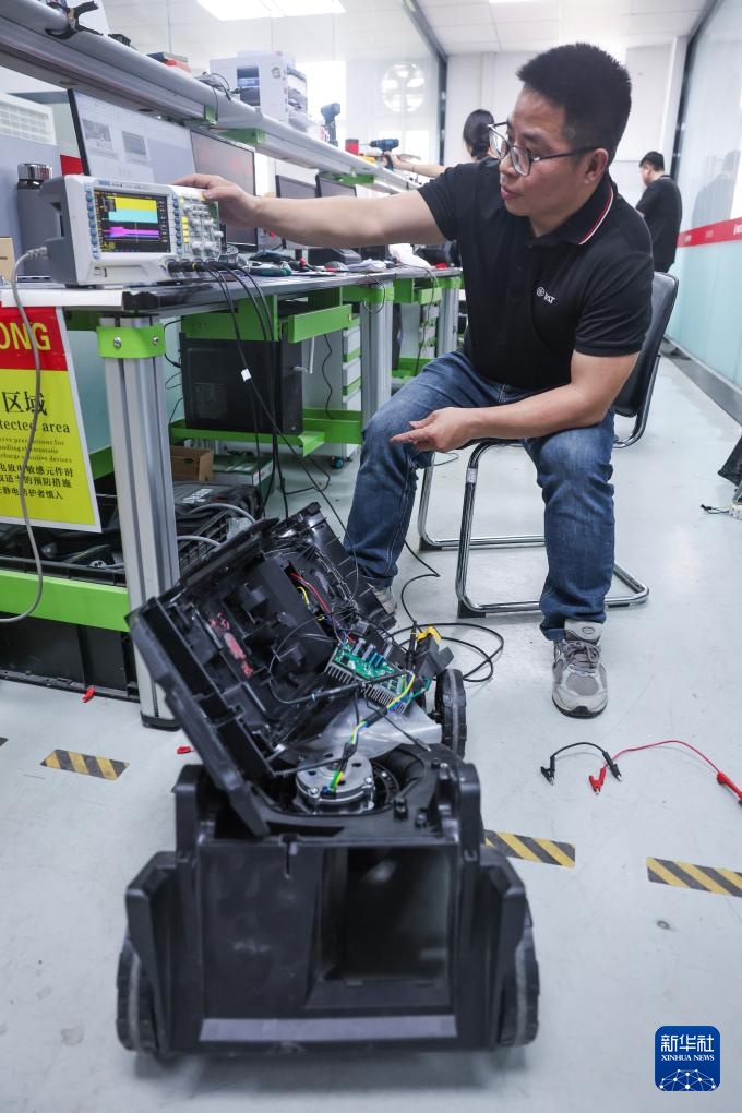 3月26日,在位于嘉兴南湖区余新镇的浙江亚特电器股份有限公司测试车间内,工作人员在对园林工具进行测试。