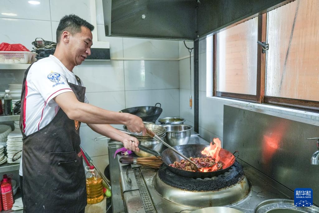 自2025年贵州“村超”新赛季开赛以后,被网友们亲切称为“董球王”的董永恒又忙开了。原来的卷粉店已经转让给亲戚,他与几名队友合伙新开了一家“村超”美食餐馆,主推牛瘪、稻花鱼等地方特色美食。