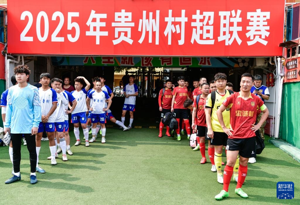 在2025年贵州“村超”40强交叉赛忠诚村队与章鲁村队的比赛开赛前,董永恒(右排前一)与队友们准备入场(3月23日摄)。
