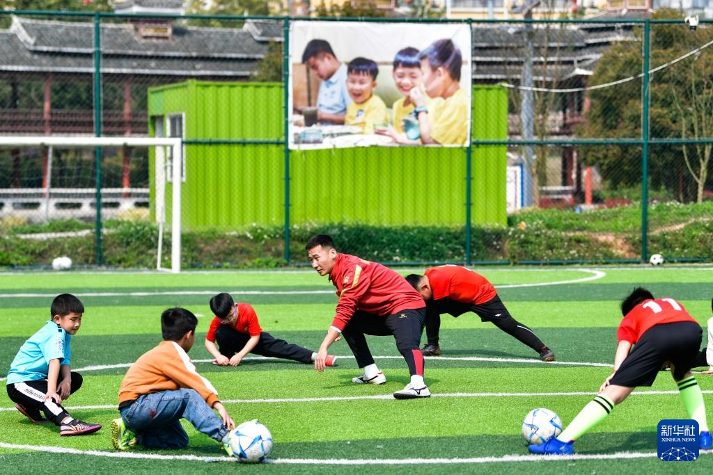 董永恒(右)为榕江县的孩子进行足球基本功培训(3月23日摄)。