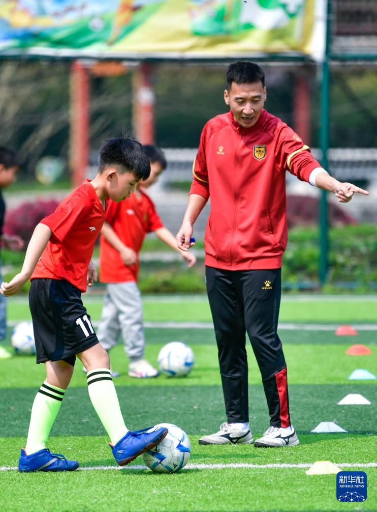 董永恒(中)为榕江县的孩子进行足球基本功培训(3月23日摄)。