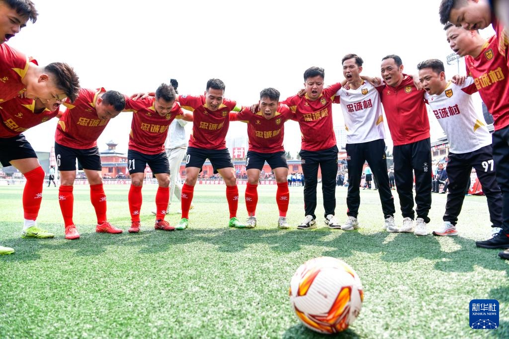 董永恒(左五)与队友们在2025年贵州“村超”40强交叉赛忠诚村队与章鲁村队的比赛开赛前相互加油鼓劲(3月23日摄)。
