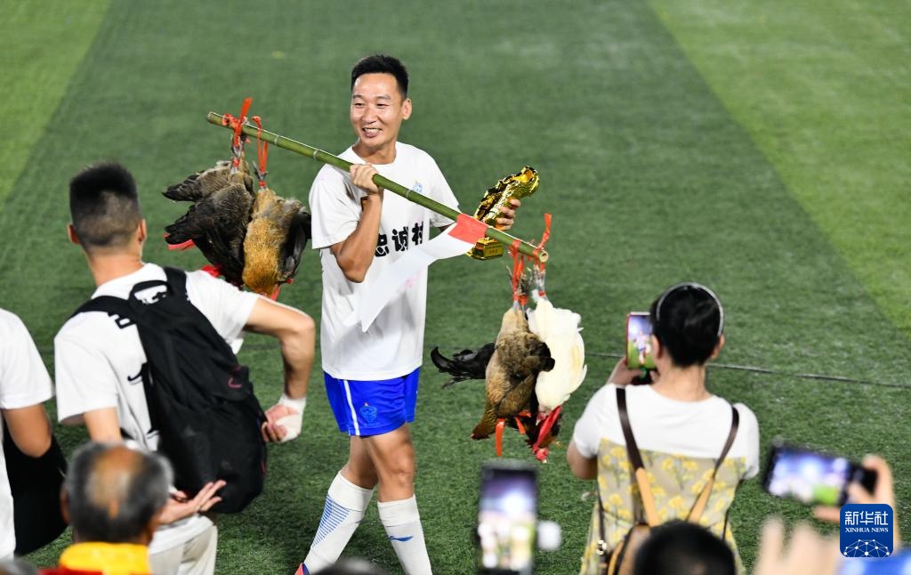 在2023年“村超”总决赛颁奖仪式上,董永恒展示获得的最佳射手金靴奖杯和奖品——榕江小香鸡(2023年7月29日摄)。