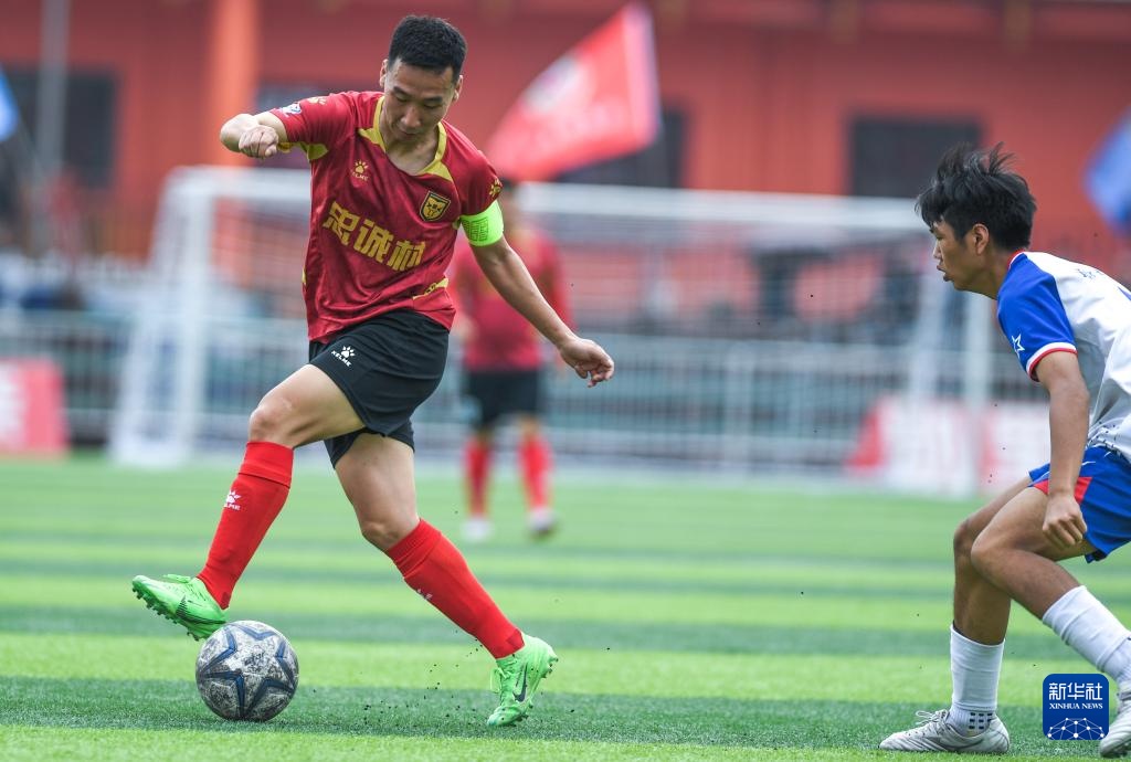 董永恒(左)在2025年贵州“村超”40强交叉赛忠诚村队与章鲁村队的比赛中带球突破(3月23日摄)。