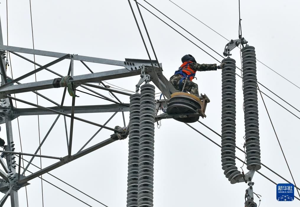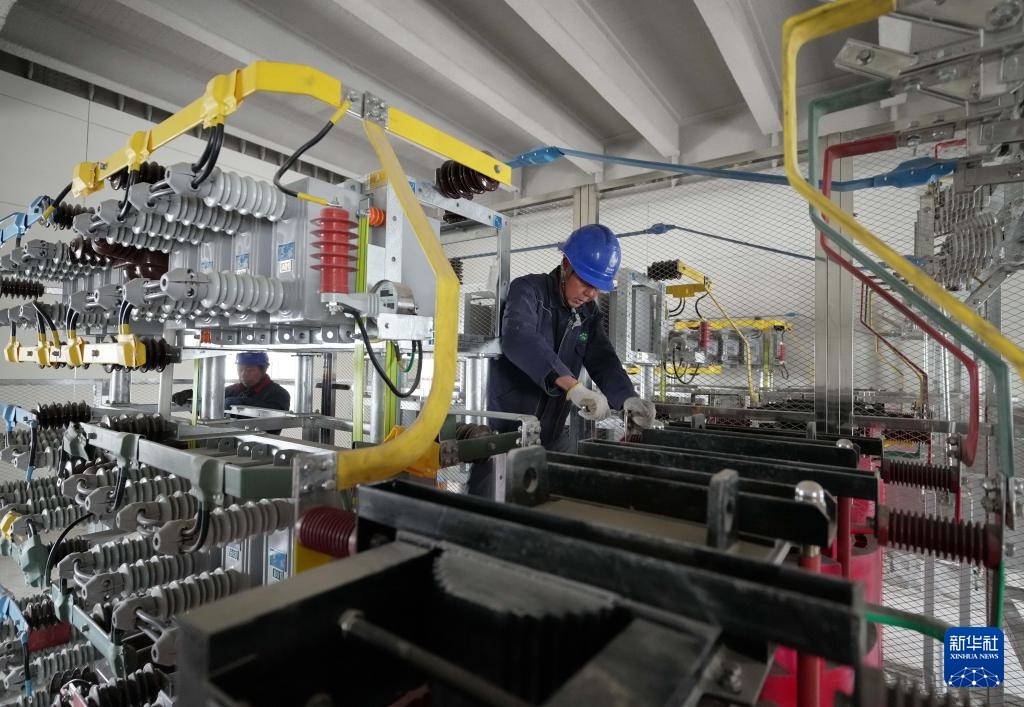 3月27日,国网沧州供电公司的工人在大白冢220千伏输变电工程建设工地施工。