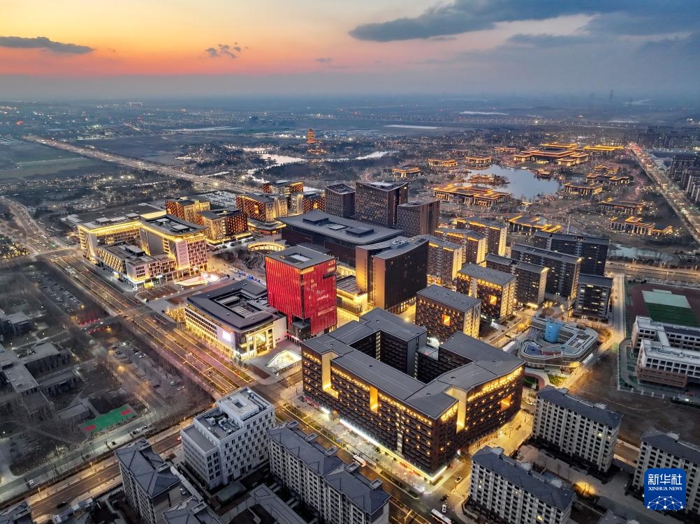 雄安商务服务中心夜景(3月15日摄,无人机照片)。雄安商务服务中心是雄安新区首个标志性城市建筑群,其朱红墙体、灰色飞檐的建筑彰显中式特色。