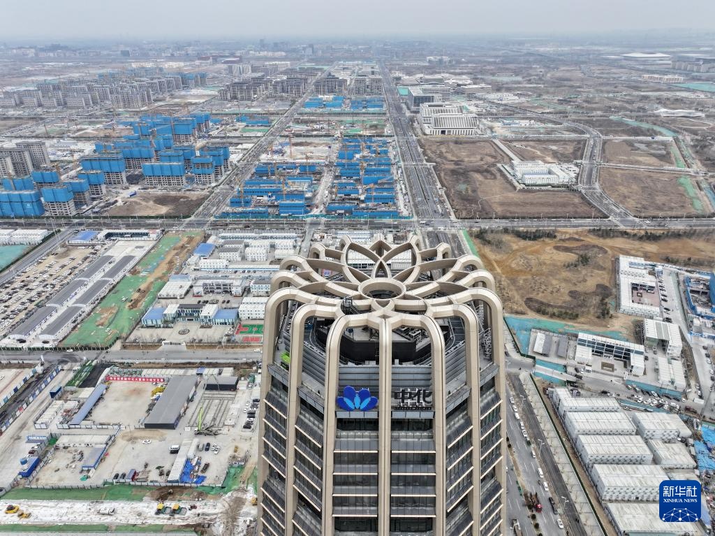 中国中化大厦位于雄安新区启动区内,这是其顶部的“牡丹花冠”造型(3月15日摄,无人机照片)。
