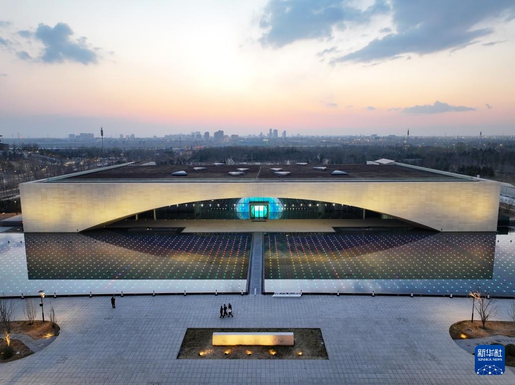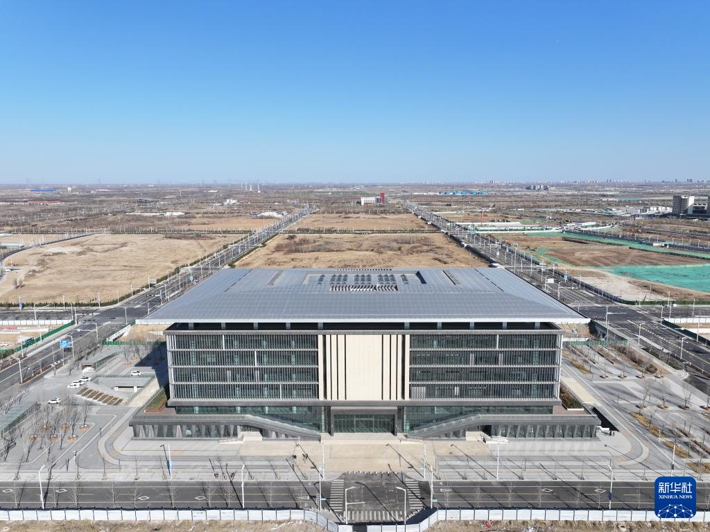 这是雄安新区大学园图书馆(3月16日摄,无人机照片)。该建筑立面设计形似简牍,折射出中国传统文化的韵味。