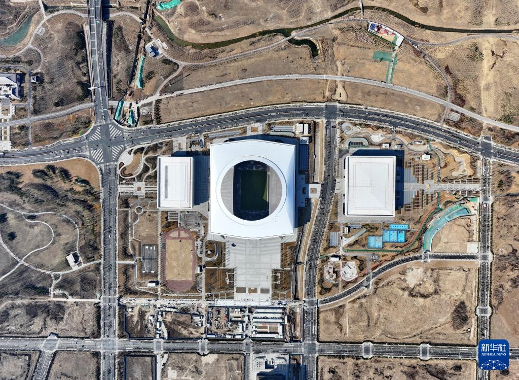 这是雄安体育中心(3月27日摄,无人机照片)。雄安体育中心的三座建筑形似三枚印章,体育场屋面呈现弧形,基座呈现方形,暗合“黄琮礼地”,方圆之间尽显中华风范。