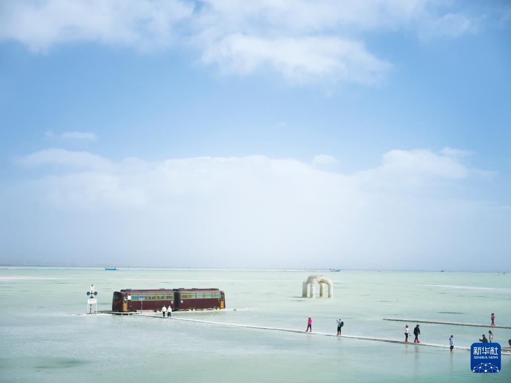 3月26日,搭乘入藏旅游专列的旅客在青海茶卡盐湖景区游玩。