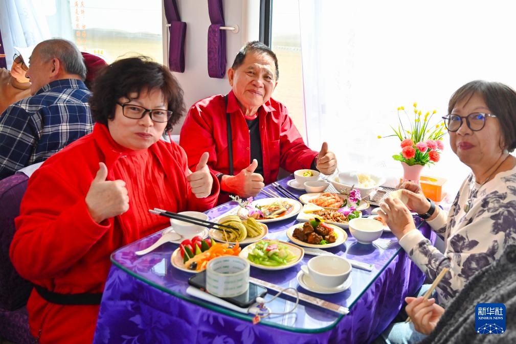 3月26日,入藏旅游专列上的旅客在餐车上品尝菜肴。