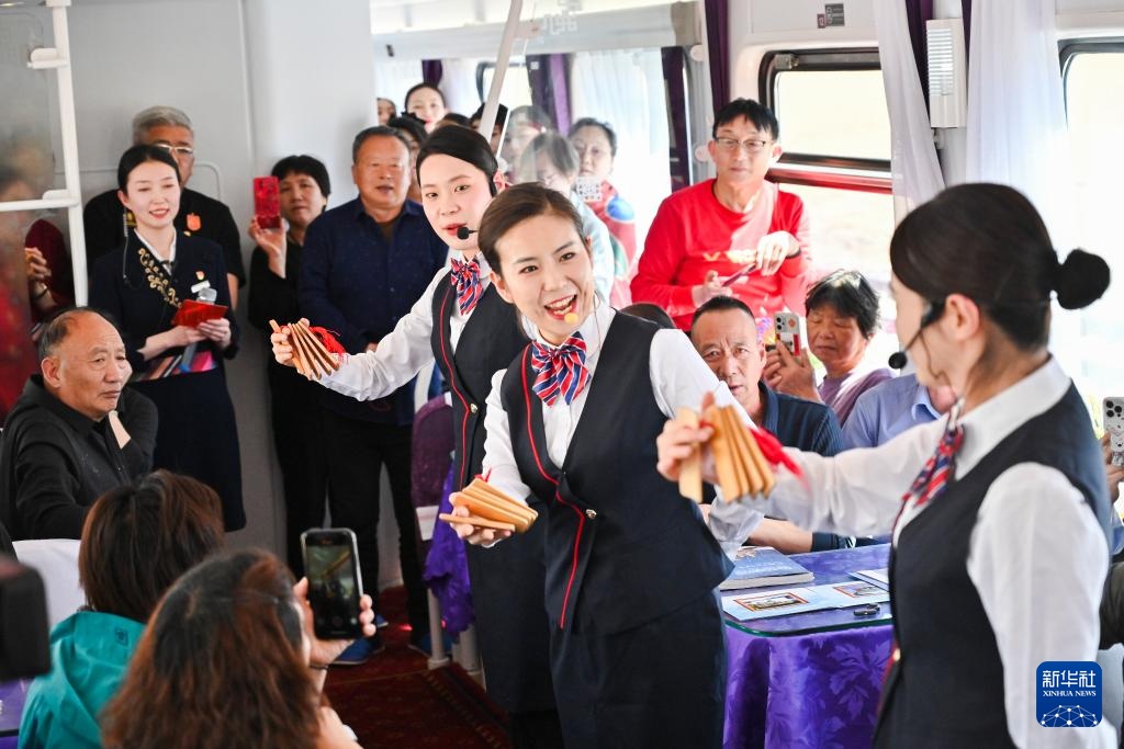 3月27日,入藏旅游专列上,由西宁客运段工作人员组成的文艺小分队为旅客表演快板。