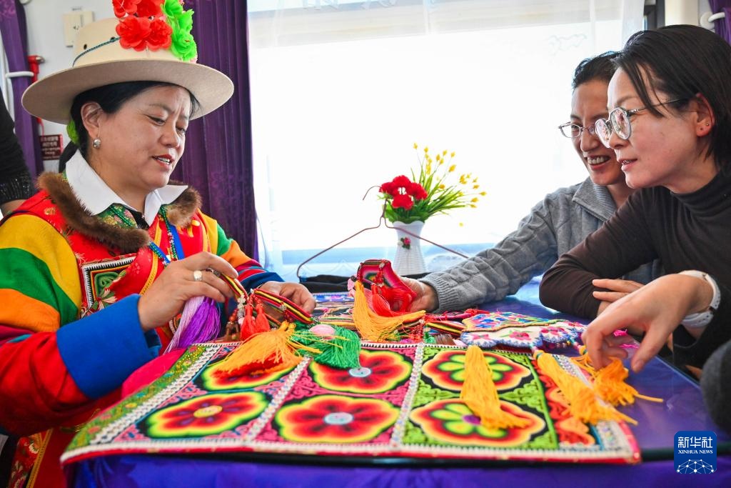 3月27日,旅客在入藏旅游专列餐车非遗展台与土族盘绣传承人互动交流。