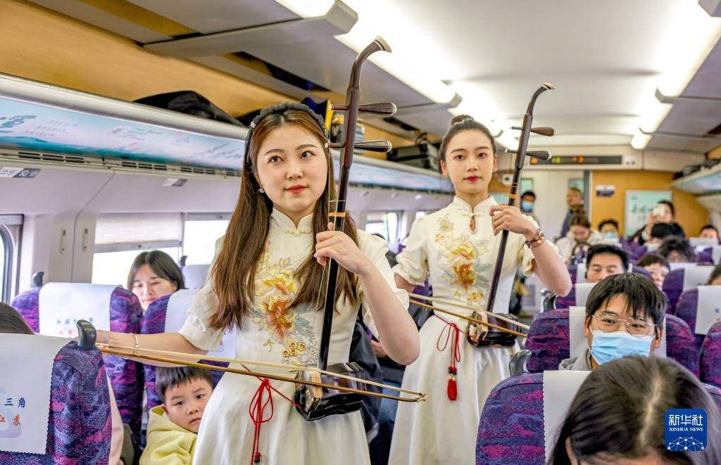 3月29日,扬州市文艺工作者在“水韵江苏”主题旅游列车上进行二胡演奏。