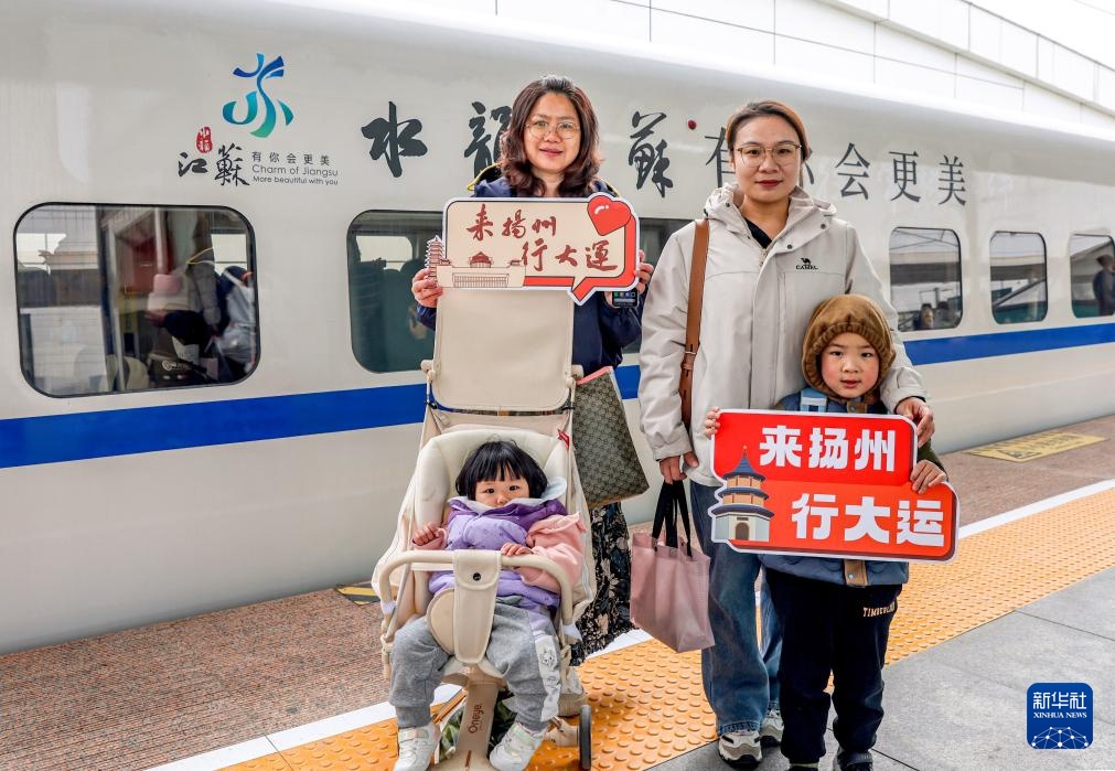3月29日,在扬州东站,游客在“水韵江苏”主题旅游列车旁合影。