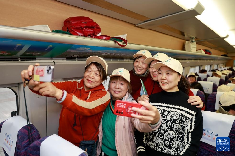3月29日,在“水韵江苏”主题旅游列车上,旅游团成员在列车上拍照留念。