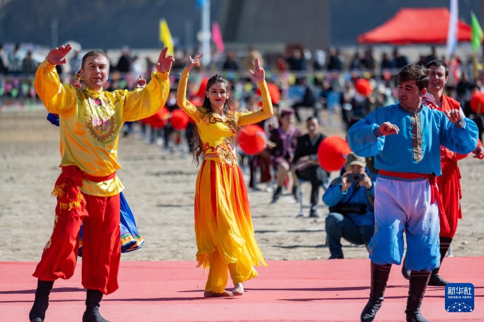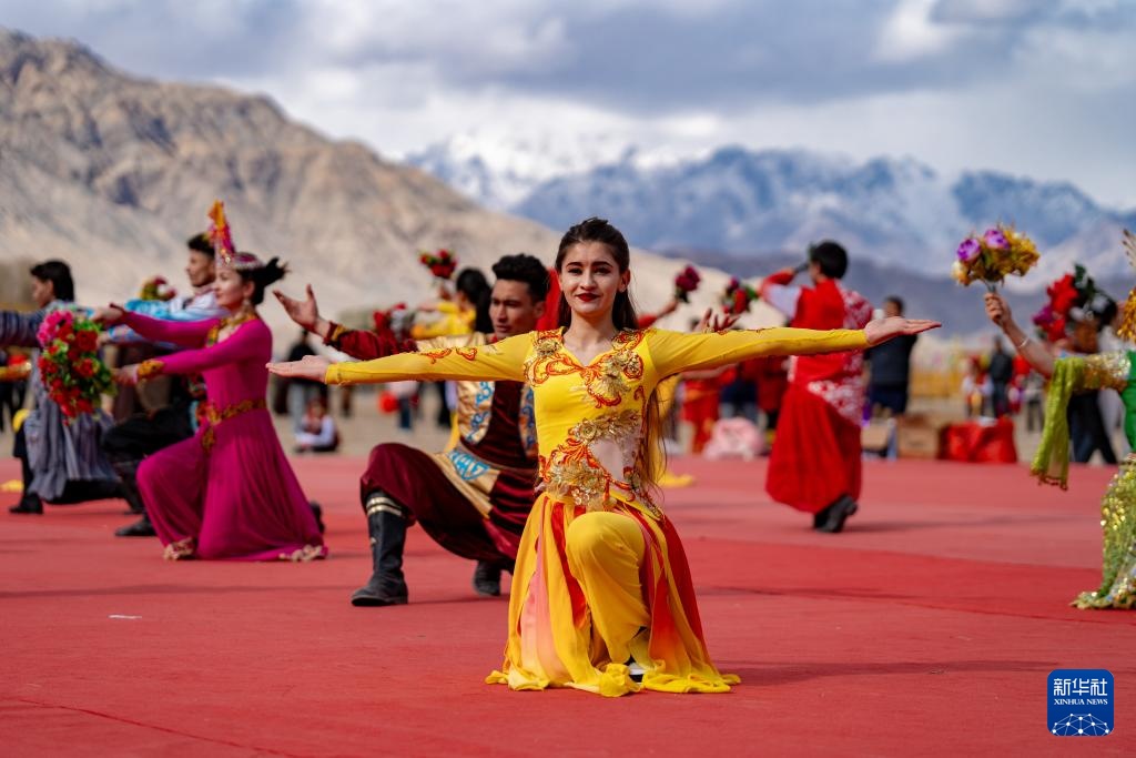 3月23日,在新疆塔什库尔干塔吉克自治县提孜那甫乡赛马场,阿曼古丽·瓦比克(中)进行舞蹈表演。