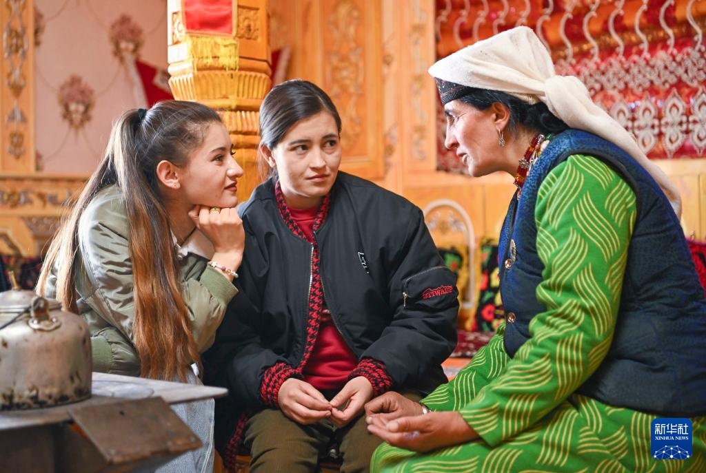 在新疆塔县塔什库尔干乡萨热吉勒尕村,阿曼古丽·瓦比克(左)和家人聊天(3月21日摄)。