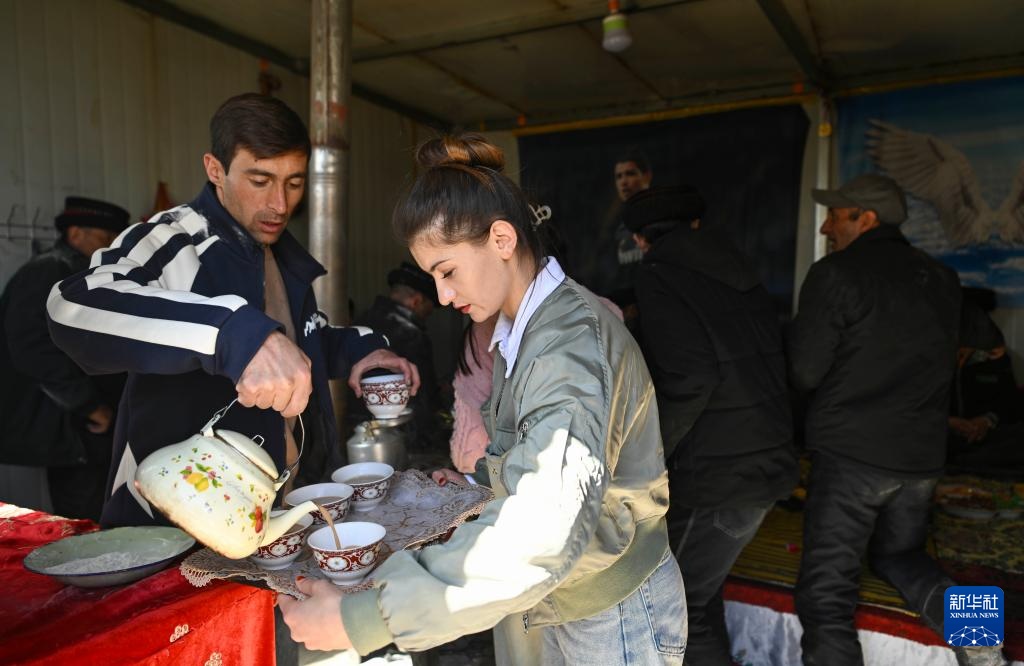 在新疆塔县塔什库尔干乡萨热吉勒尕村,正值塔县“迎春节”,阿曼古丽·瓦比克(右)和大哥一起为客人倒奶茶(3月21日摄)。
